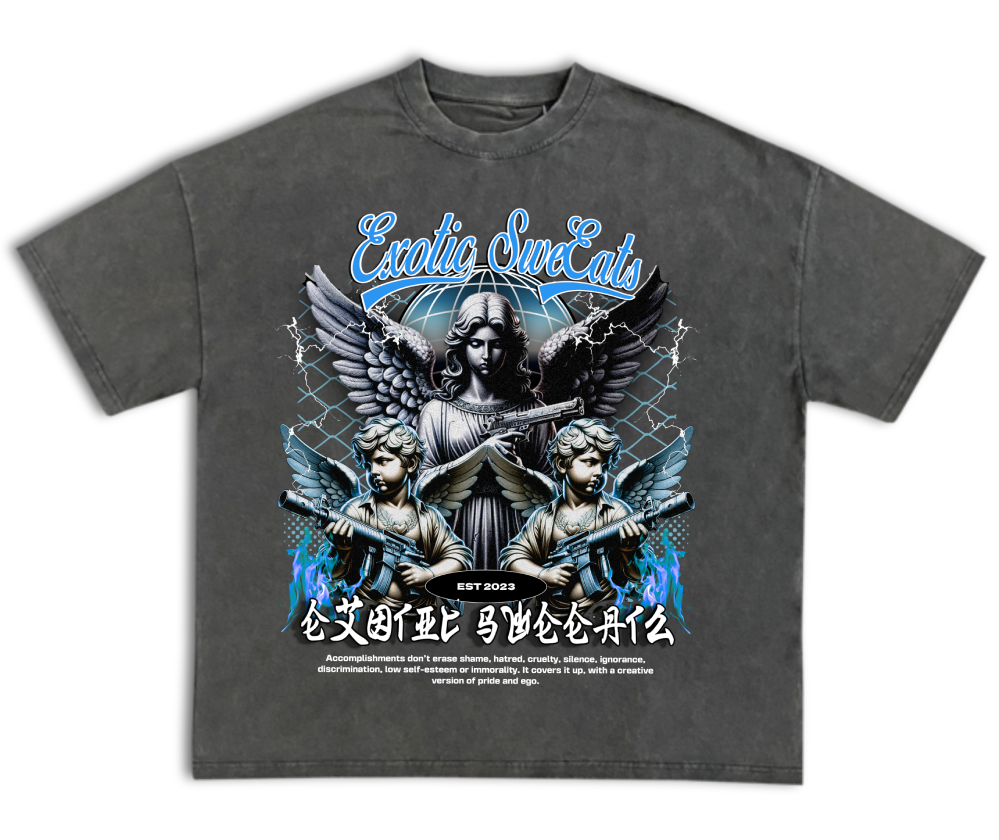Believe in Saints T from Exotic Sweeatz redefines streetwear with a gray acid wash finish on a 425 GSM heavyweight body timeless, bold, and built for those who move with purpose.